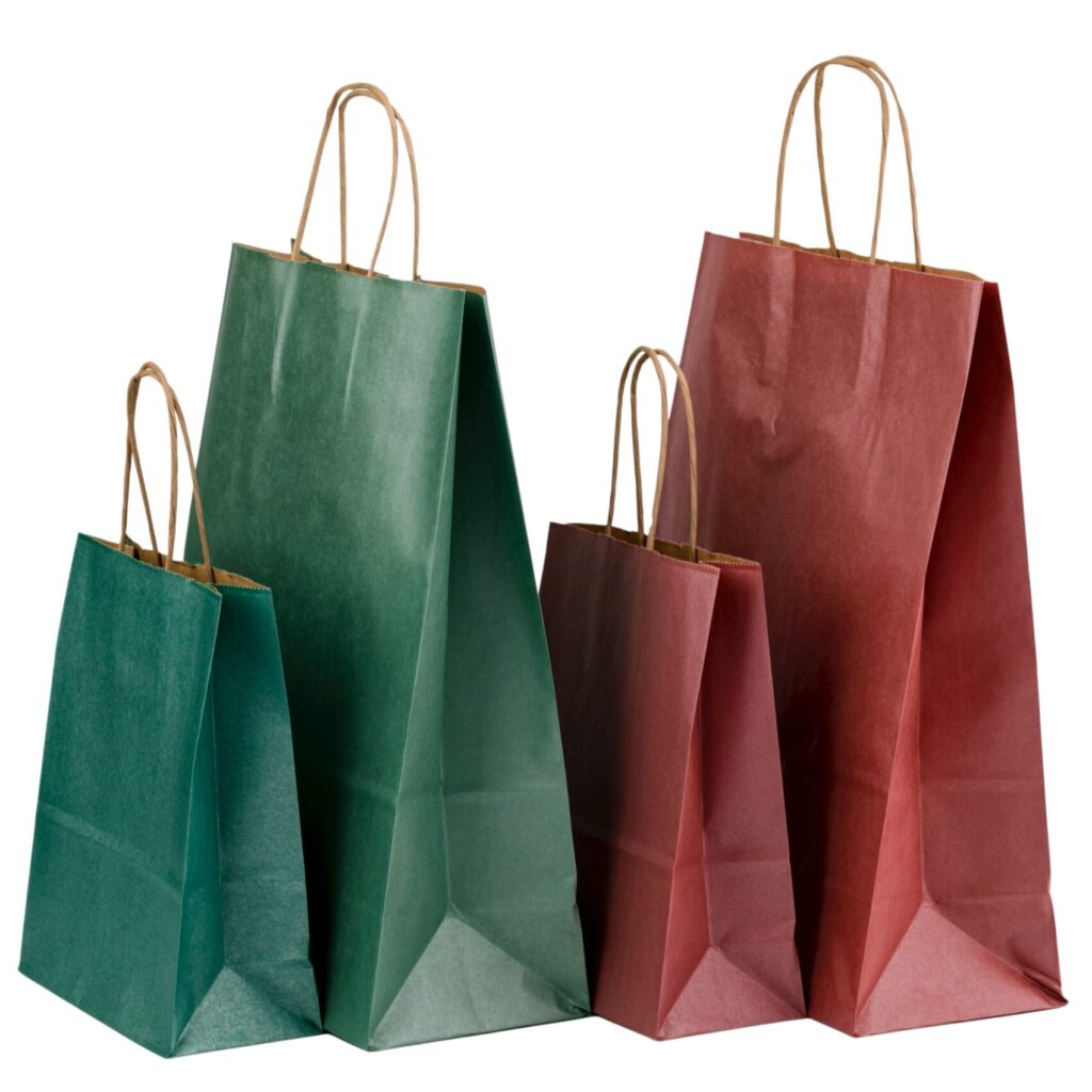 Met een gedraaid papieren handvat in dezelfde kleur als de tas.